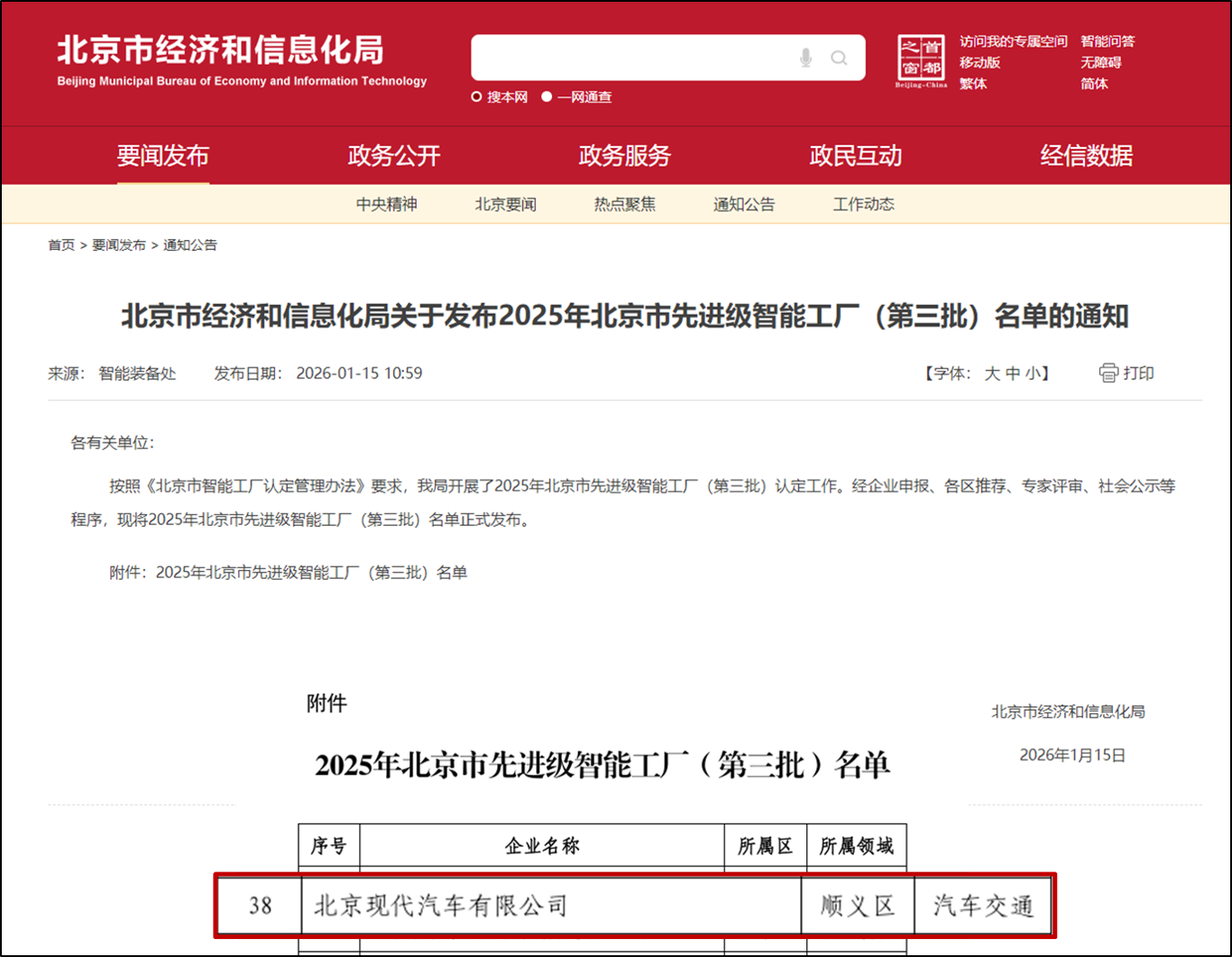 近日,北京市经济和信息化局公布了2025年北京市先进级智能工厂(第三批)名单,北京现代凭借在智能制造领域的深厚积淀与创新实践,成功斩获此项权威认证。